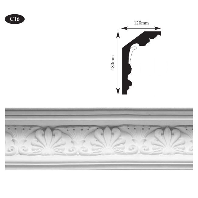 Medium/Large sized, Honeysuckle leaf patterned plaster cornice. This is a very traditional plaster cornice and we have supplied this style to some Greek Thomson style properties throughout Glasgow. Perfect size for ceiling heights of 10 feet or more. We have a lovely range of plaster ceiling roses, corbels and mouldings to go with our cornice designs so pop into our showroom to discuss your project.