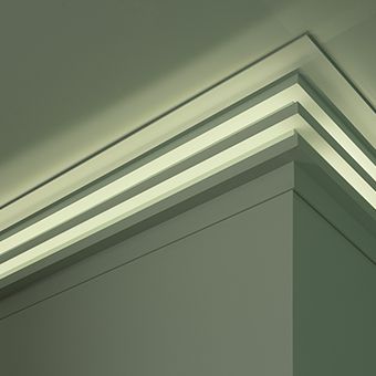 Medium / large sized, linear uplighting / downlighting coving. The Orac C382 is one of the latest LED uplighting coving designs from our Modern Collection. With this contemporary linear design, you can incorporate indirect LED lighting into your interior to create stunning mood lighting. The design of this profile gives the illusion of multiple mouldings joined together and the chamfered edges also give a lovely shadow line along the ceiling or wall.