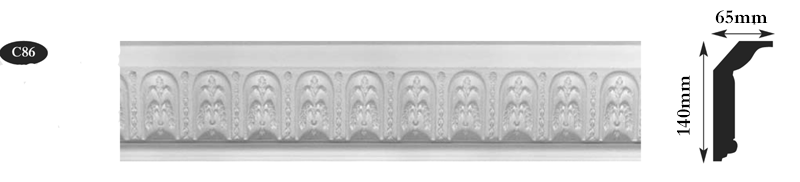 Medium sized, flat decorative style cornice. This is an unusual Victorian style cornice which is more like a frieze on the wall. It is highly decorative with a vertical arched design and bluebell style flowers. Thsi size of cornice is best suited to rooms with ceiling heights of 3 metres or more.