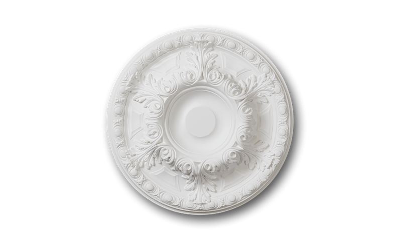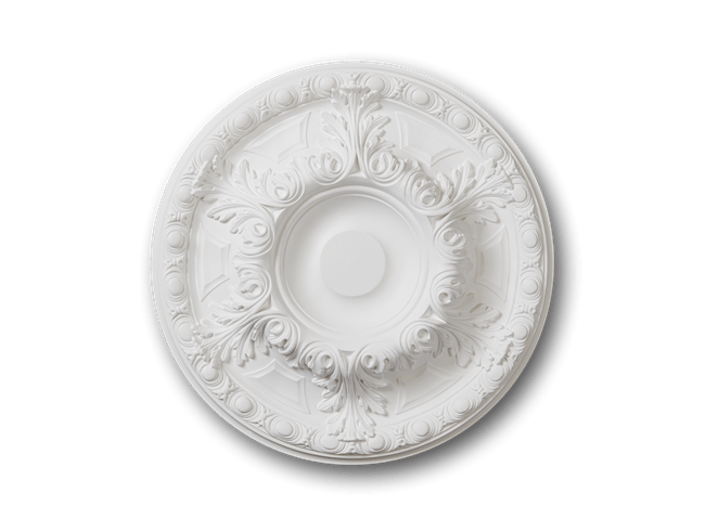 Medium sized traditional Victorian style ceiling rose with ornate acanthus leaf design and egg-and-dart border. Perfect for adding a touch of sophistication to period properties or enhancing contemporary interiors with heritage character. Designed as a base for chandeliers and light fittings, and suitable for smaller sized living rooms or bedrooms. The centre of this rose has a wider plain section making it suitable for most light fittings.