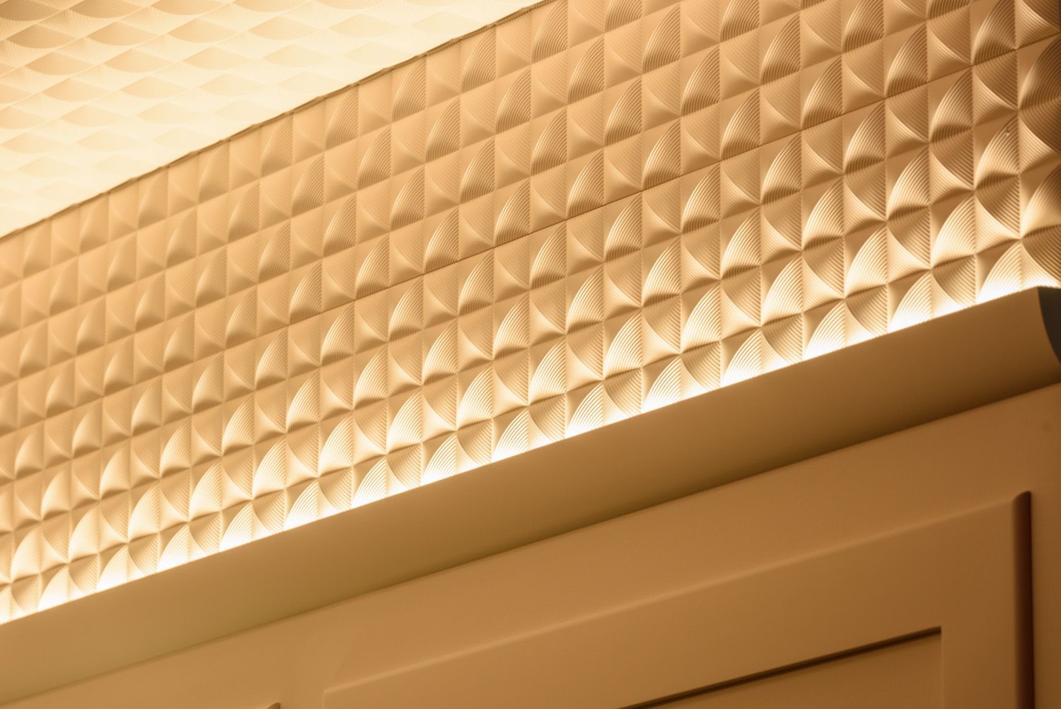 DESIGN IDEA: Add character to you walls by using this 3D wall panel above picture rail height and run up to the ceiling or below your coving. Try adding an LED light to your picture rail to create the feel of more height and light to your room. Our C323 or C324 or covings are a great option for use as a picture rail as they are both small but have the gap to incorporate the lighting.